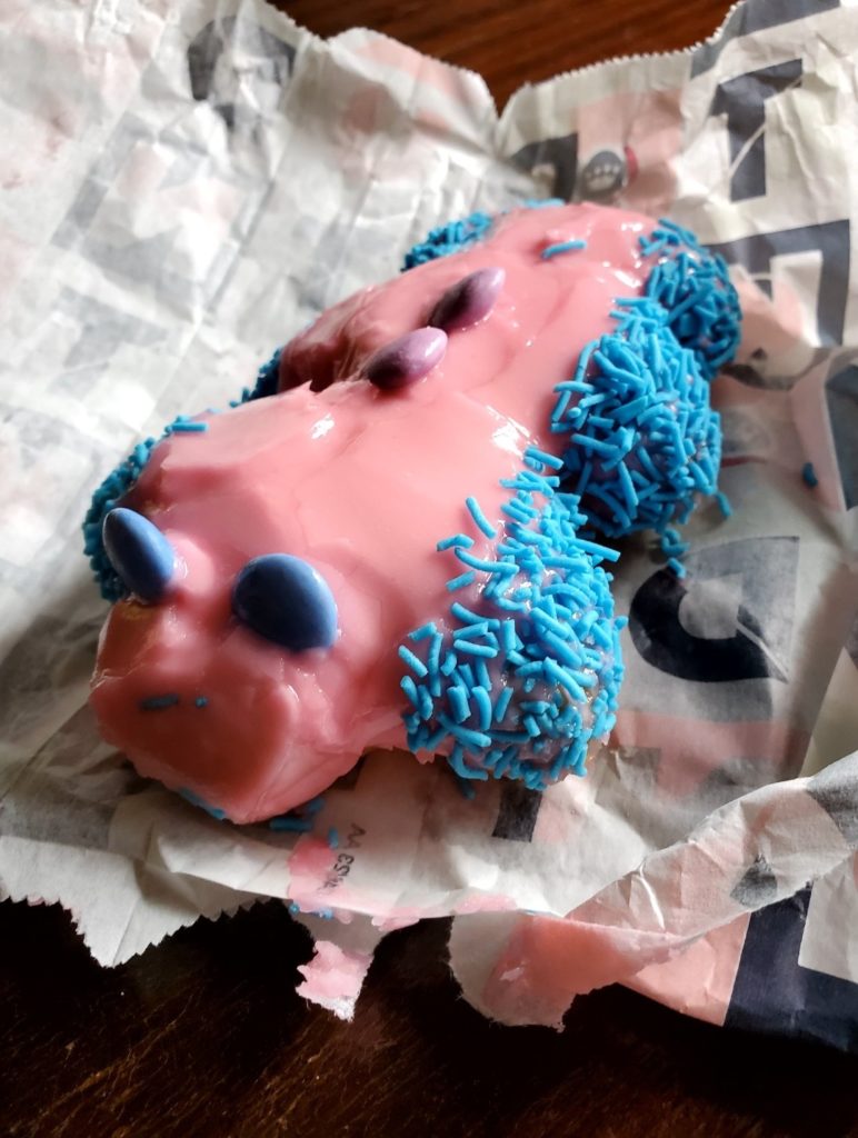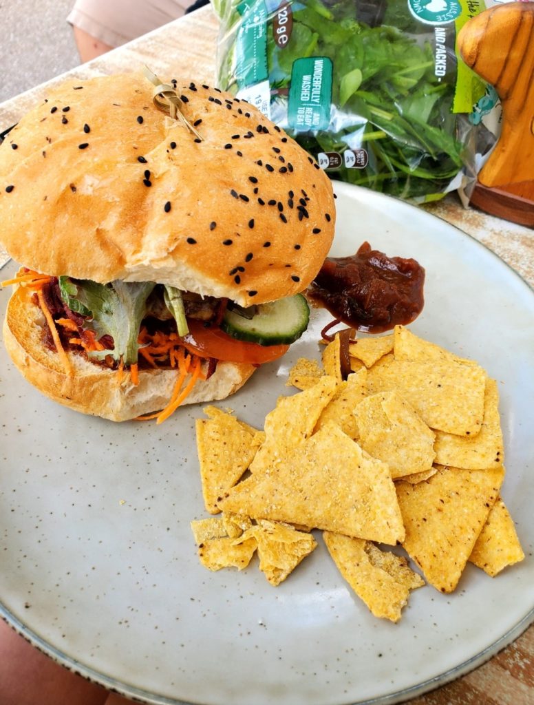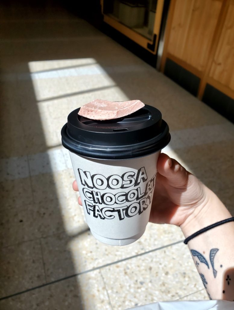 Some days later, I went to a shopping center in Noosa. I stopped at a chocolate store, and it was incredible! They had so many different types that I couldn’t make a choice. I took a hot chocolate because it was their specialty. They gave me free piece of raspberry chocolate that was… delightful! After, for pleasure, I bought a donut in the shape of a crocodile. Tasty! I also had my first meal with meat, and it was magical! The burger was delicious. (Everything was healthy?)