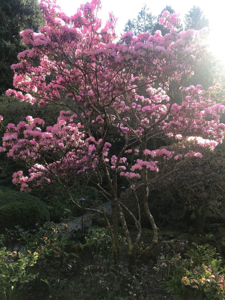ornamental cherry trees, magnolia trees, peony’s, daffodil’s and rhododendron are the garden’s